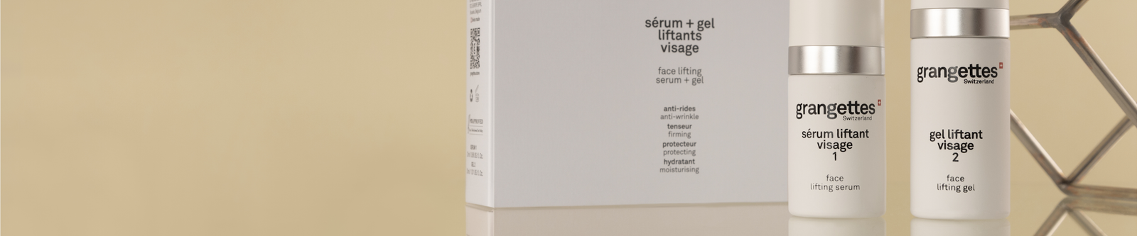 The care duo Face lifting serum + gel Grangettes Switzerland is ideal for sustainably filling gaps deep wrinkles and furrows on the face. The combined action of anhydrous hyaluronic acid serum a you moisturizing gel have several advantages: